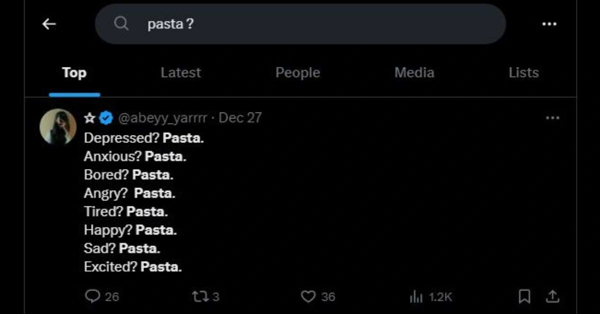 اگر در توییتهایی که در پاسخ به توییت دیگری نوشتهشدهاند دنبال واژهی خاصی میگردید، دستور filter:replies کمکتان میکند. در نمونه زیر این فیلتر را با واژه «پاستا» امتحان کردیم: