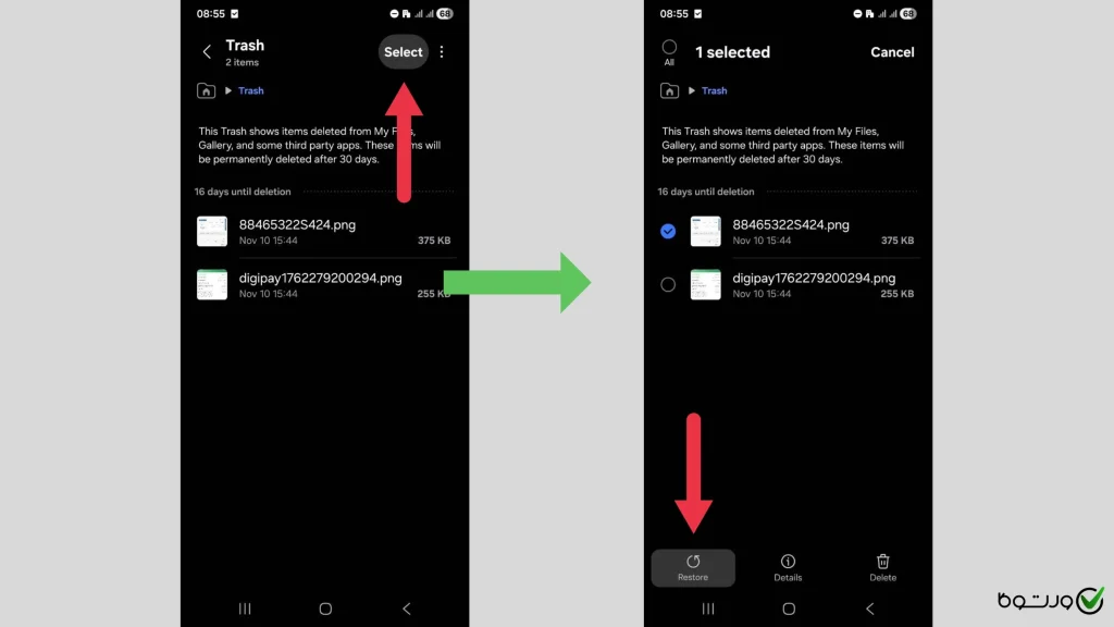 فایلهایی که در این قسمت مشاهده میکنید تا ۳۰ روز پس از حذف در حافظه موقت ذخیره میشوند؛ مگر اینکه پیش از پایان این مدت، محتوا را بهصورت دستی حذف دائمی کنید. برای بازیابی فایلهای پاکشده کافی است دکمهی Select (انتخاب) را بفشارید و موارد موردنظر را انتخاب کنید و سپس گزینه Restore (بازیابی) را لمس کنید.