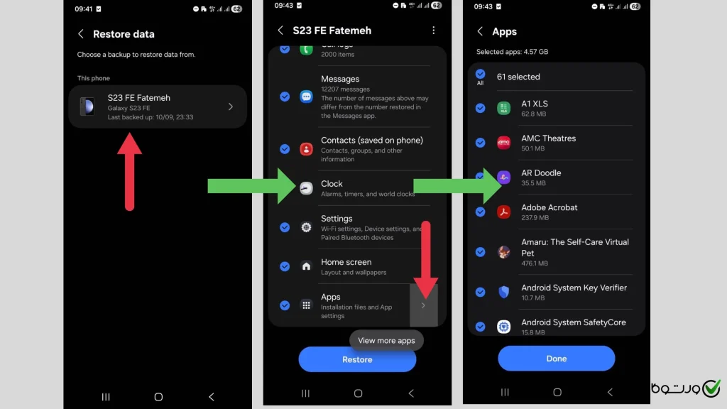 در صفحه جدید نام دستگاه و آخرین تاریخ پشتیبانگیری را مشاهده میکنید. با فشردن آن، تمام برنامههای قابلبازیابی برایتان نمایان میشوند تا تصمیم بگیرید اطلاعات کدام برنامه بازیابی شود. پس از این کار کافی است دکمهی آبیرنگ Restore را بفشارید تا بازیابی صورت بگیرد.
